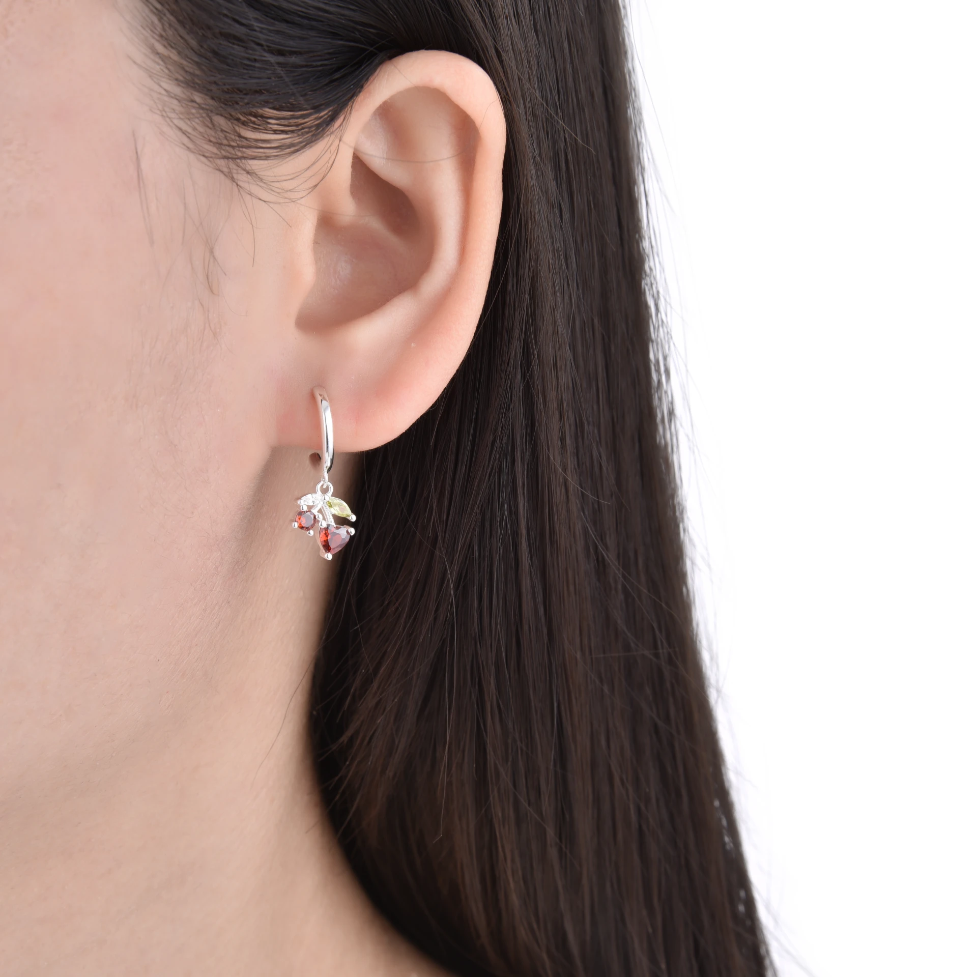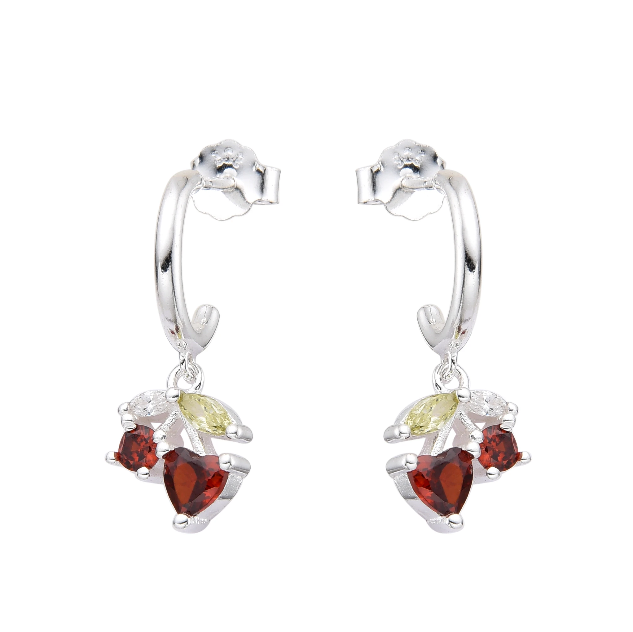 Aros con Cristal de Plata 925 Importada, Media Argolla con detalle de Dije Cereza. Tiene alrededor de 2.4gr