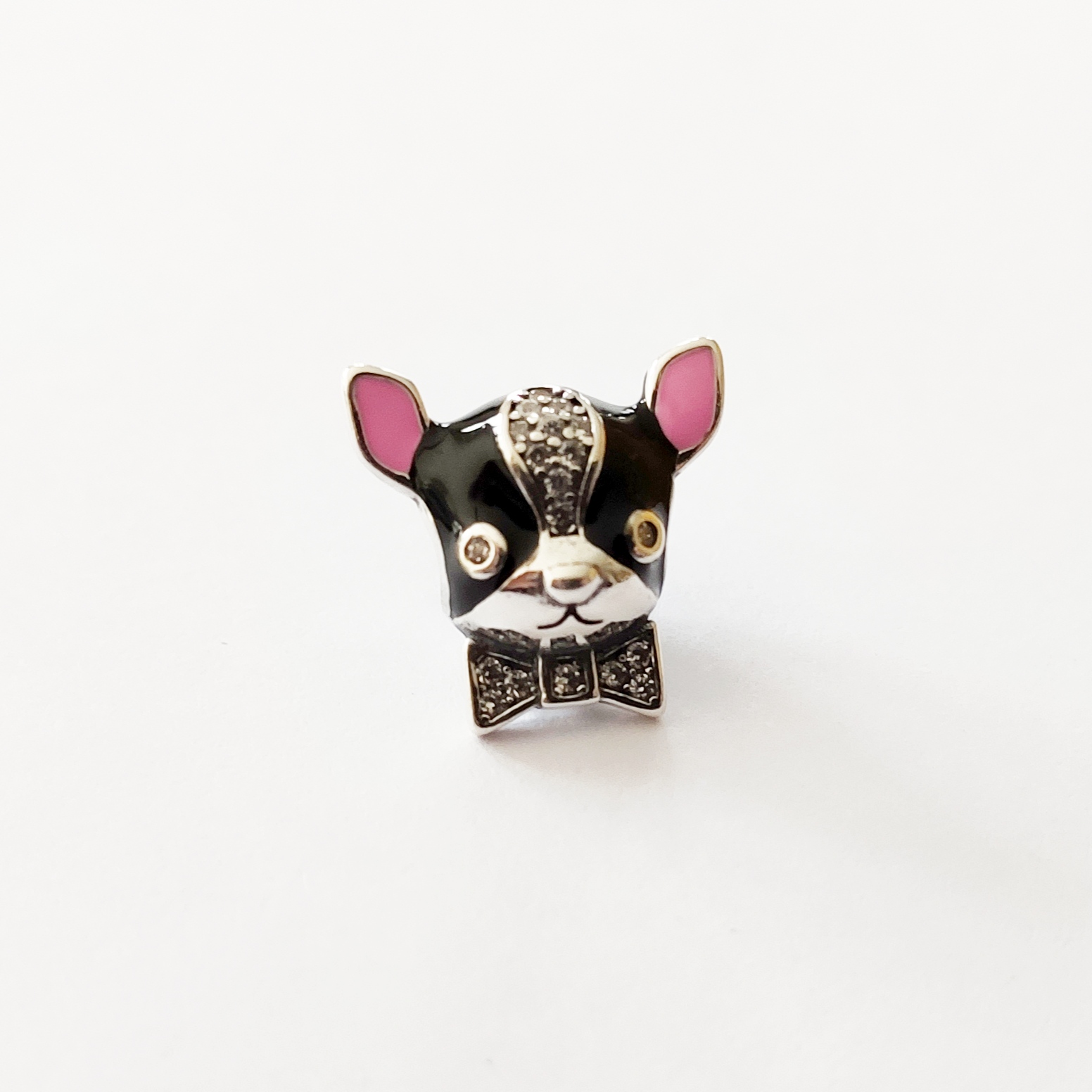 Dije Pandora Esmaltada de Plata 925 Importado, en forma de Bull Dog Frances con detalle de Esmaltado y Zircón. Tiene aproximadamente 2.5gr y mide alrededor de 12mm.